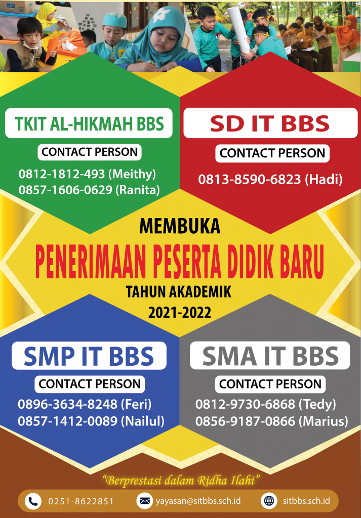 Menyambut tahun pelajaran 2021-2022, SIT BBS dengan bangga menyambut para calon siswa-siswi baru untuk dapat bergabung menjadi keluarga besar BBS di berbagai unit pendidikan mulai dari TK, SD, SMP hingga SMA.